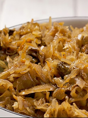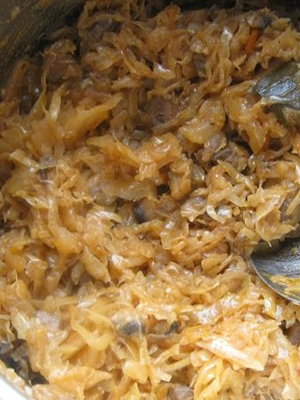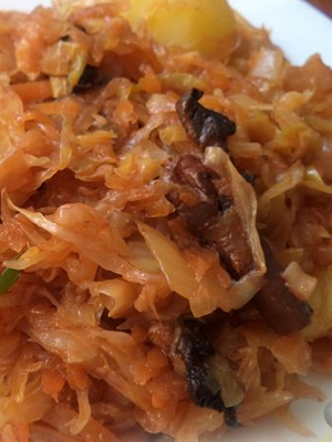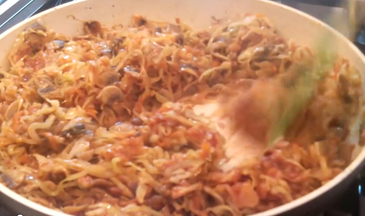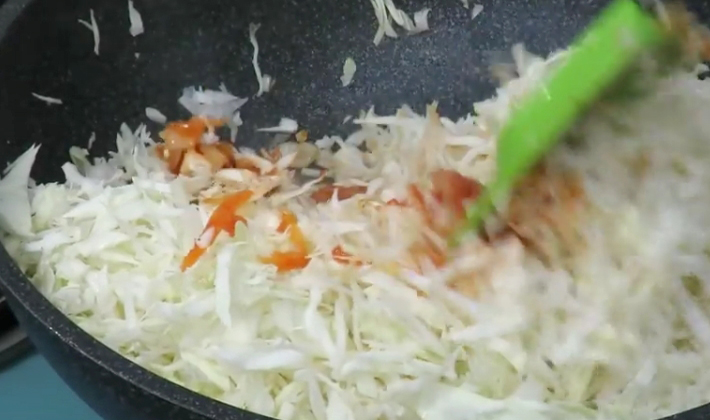 - Faites d'abord frire l'oignon jusqu'à ce qu'il soit doré, puis ajoutez le chou et les champignons en ajoutant de l'huile.