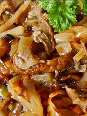 - Ajoutez les champignons, le reste des épices, y compris le vinaigre, et laissez mijoter pendant 20 minutes à feu doux.