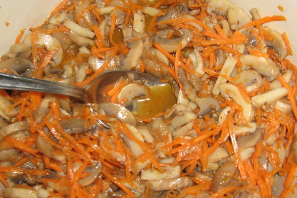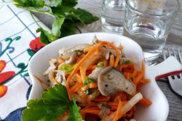 Tremper les pleurotes dans la marinade et laisser bouillir 15 minutes, puis les transférer dans les carottes en coréen. Nous ne versons la marinade nulle part, nous en avons besoin.