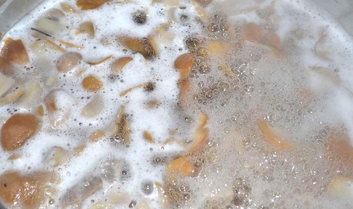 Mettez les champignons dans la saumure bouillante et faites-les bouillir pendant 5-6 minutes, puis ajoutez le vinaigre aux champignons et à la saumure et portez à ébullition.