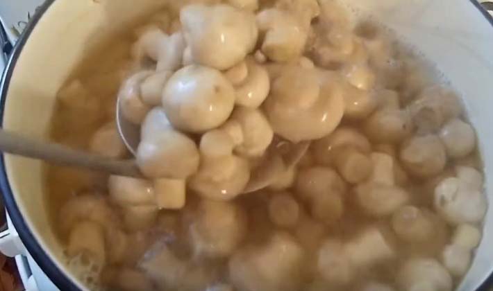 - Ajouter l'huile végétale dans la casserole, porter à ébullition, mettre les champignons dans l'huile bouillante et laisser bouillir pendant 10 minutes.