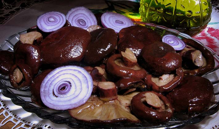 Les champignons cuits avec de la saumure sont placés dans des barils ou des canettes et couverts. Le cornichon des poitrines noires acquiert une couleur cerise pourpre, des poitrines blanches - bleuâtre. Ces champignons sont prêts à être utilisés dans 40 à 50 jours. Vous pouvez faire cuire les champignons dans du vinaigre de manière différente. Faire bouillir dans de l'eau salée sans épices. Videz l'eau, rincez les champignons à l'eau froide, jetez-le dans une passoire ou suspendez-le dans un sac de tissu rare pour mettre l'eau en verre. Champignons mis en couches dans les plats cuisinés, saupoudrés de sel et d'épices. Pour 1 kg de champignons bouillis: