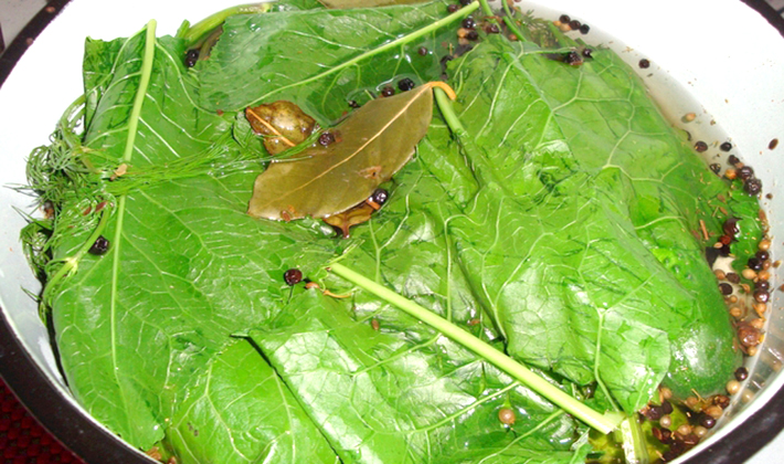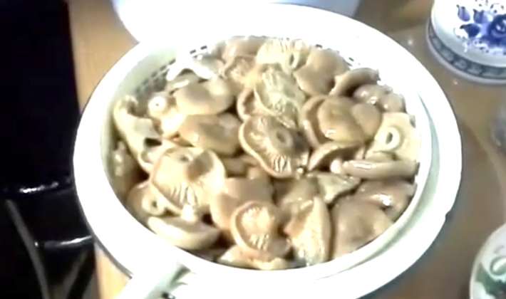 - Laissez les champignons s'écouler de l'excès de liquide, et pendant ce temps ébouillantez-les avec de l'eau bouillante, des feuilles fraîches et sèches.