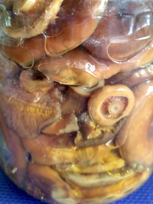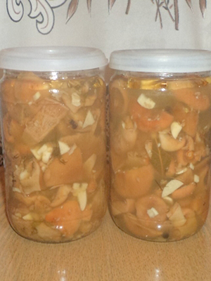 Les champignons de safran salés peuvent également être fermés sous des capsules de fer, comment faire cela? Pour ce faire, dans chaque bocal, vous devez verser 2 à 3 cuillères à soupe de champignons sur le dessus. l huile végétale, chauffée dans une casserole et roulée.