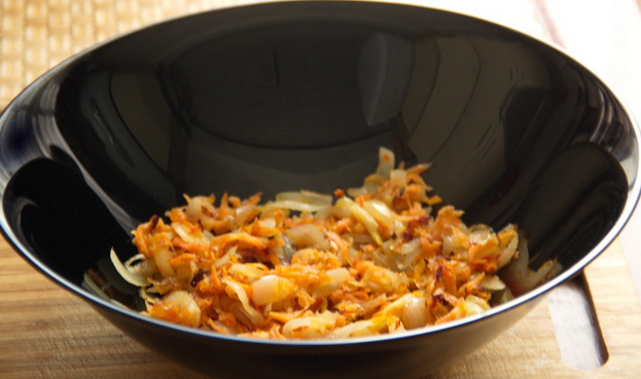 - Les oignons sont pelés, hachés en demi-anneaux et sautés dans de l'huile végétale jusqu'à ce qu'ils soient dorés.