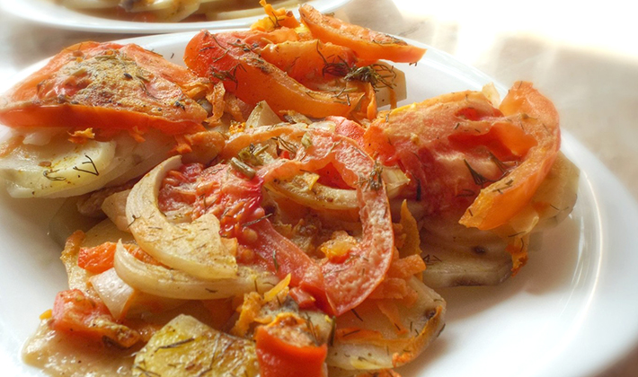 Nous introduisons les tomates dans les champignons, ajoutons, poivrons et frites pendant 20 minutes sous un couvercle fermé.