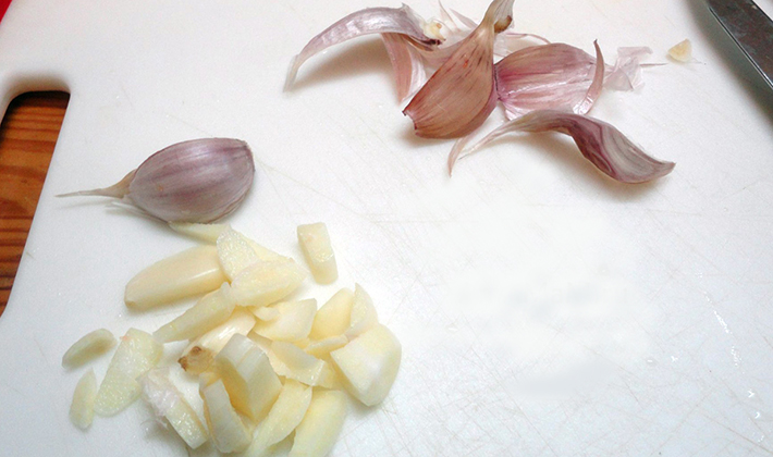 Nous nettoyons les tranches d'ail de la coque, coupées en fines assiettes.