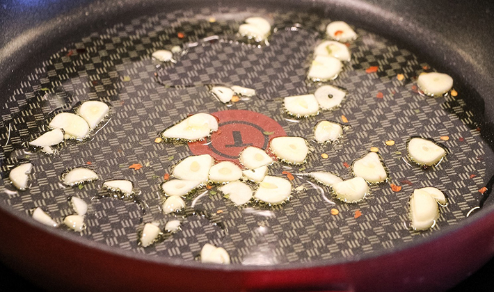 Mettez l'ail dans l'huile chauffée et faites-les frire jusqu'à ce qu'ils soient dorés.