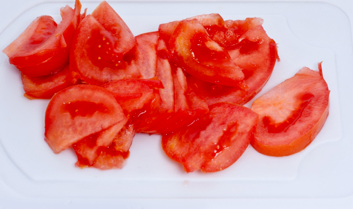 Nous essuyons les tomates avec une serviette humide et coupons en tranches.