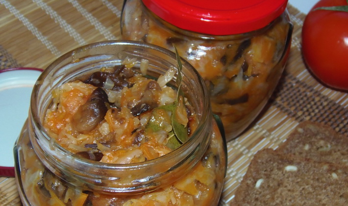 Champignons Les champignons pour l'hiver à la sauce tomate peuvent être préparés sous la forme d'un méli-mélo. Les ingrédients supplémentaires pour la recette seront le chou, les carottes et les oignons. La solyanka peut être ajoutée à la soupe, au ragoût ou à la garniture de tartes ou de crêpes, ou simplement être mangée séparément.