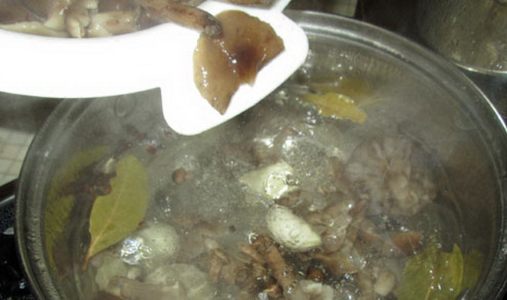 - Porter la saumure à ébullition et mettre les champignons à ébullition, laisser bouillir pendant 10 minutes.