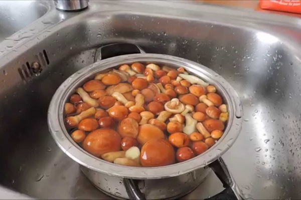 Trempez les champignons frais pelés dans de l'eau bouillante et laissez cuire 20 minutes à feu moyen jusqu'à ce qu'ils coulent au fond.