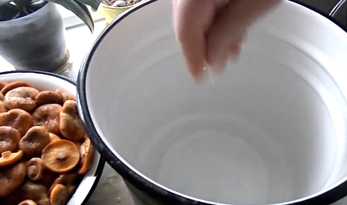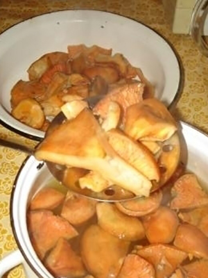 - Mettez de l'eau sur le feu dans une casserole émaillée, laissez bouillir les champignons préparés et versez.