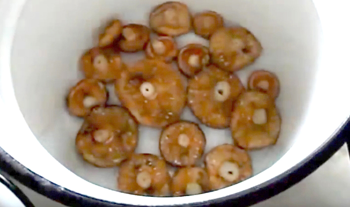 - Mettez les champignons chauds dans des bocaux stérilisés, sans condensation dense, et versez au sommet avec l'huile végétale dans laquelle ils ont été frits.