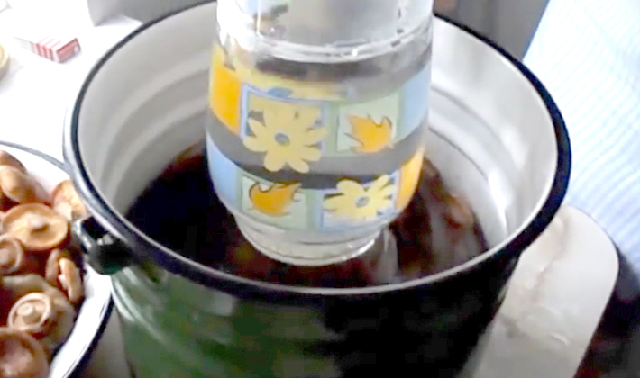 - Versez de l'eau bouillante sur les canettes et mettez un peu d'oppression dessus pour que les champignons soient immergés dans la saumure.