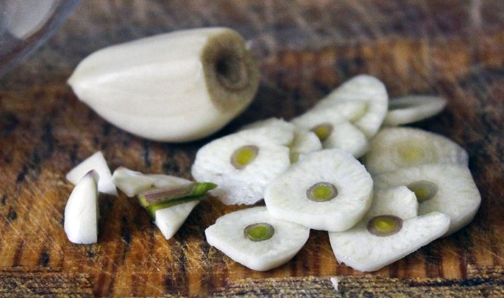 - Hachez l'aneth, hachez l'ail en tranches.
