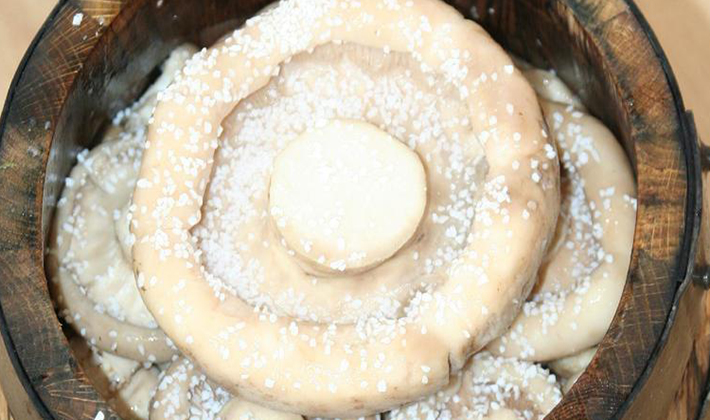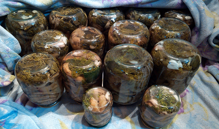 Lorsque les champignons se déposent un peu, sont compressés, le conteneur est complété par des champignons frais, fermement bouchés en liège et placés dans un glacier, où il est secoué, bercé ou roulé chaque semaine (par exemple, des barils) pour répartir uniformément la saumure.Ils veillent particulièrement à ce que le récipient ne coule pas et que les champignons ne soient pas exposés à la saumure et ne gèlent pas au froid. Comme vous le savez, les champignons sans saumure noircissent, la moisissure et le gel deviennent mous, sans goût et se détériorent rapidement.