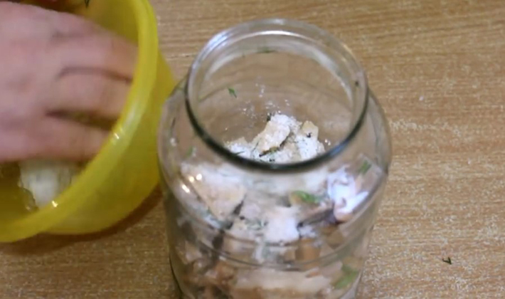 Ensuite, ils sont salés de la même manière que dans la méthode à froid, déposant couche par couche les champignons, les assaisonnements (aneth, feuille de cassis, ail, poivre, etc.) et le sel.