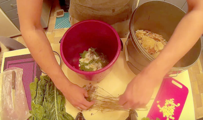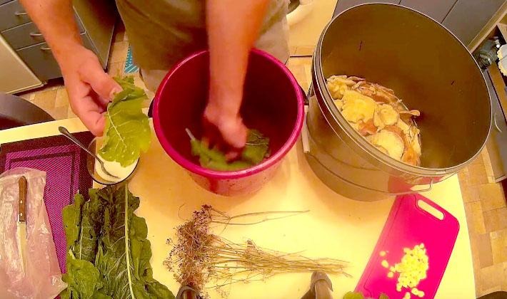 - Dans des pots stérilisés d'une capacité de 2 ou 3 litres, mettez des feuilles de cerisier propres, une partie du parasol à l'aneth, du gingembre, du mélange de poivre en grains.