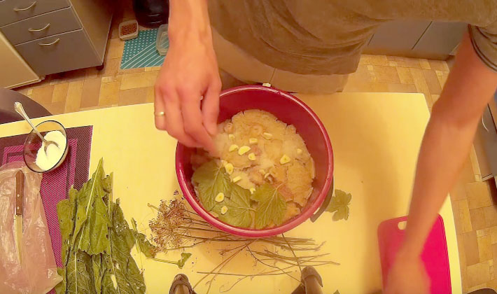 - Dans un récipient émaillé propre, nous répartissons les pièges trempés en couches avec les assaisonnements et les épices indiqués dans la recette (épluchez la racine de raifort et râpez-la sur une râpe grossière).