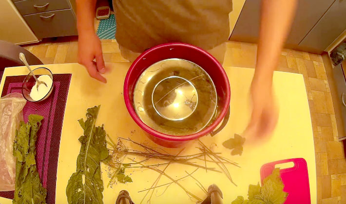 Au fond d'une casserole émaillée, étalez les feuilles de cerisier et de chêne, les brins d'aneth et versez une fine couche de sel.