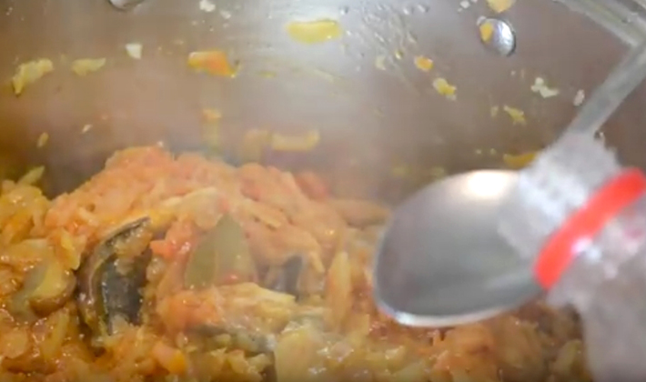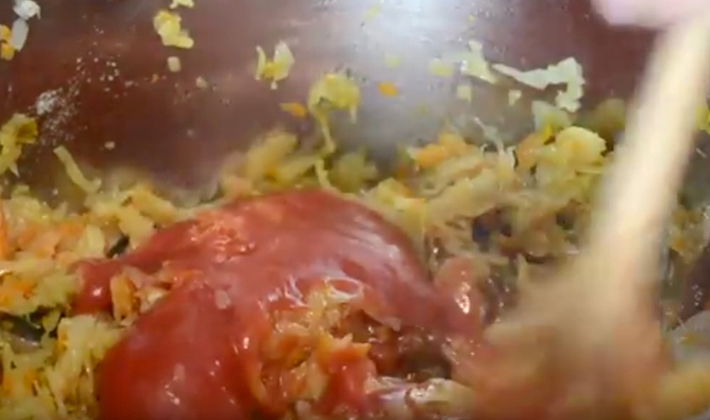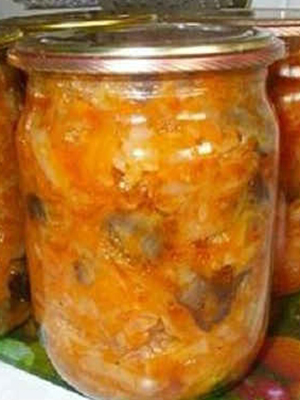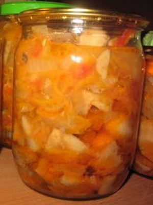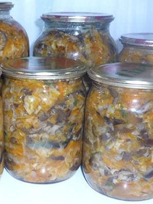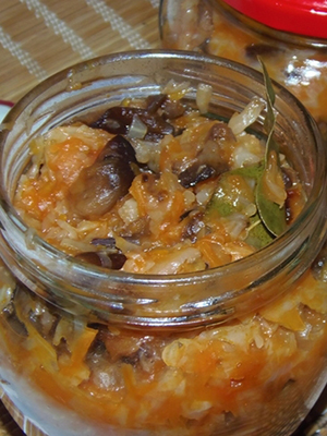 Commencez par placer les champignons sur un tamis ou une passoire pour éliminer l'excès de saumure. Hacher soigneusement l'oignon et le chou avec des pailles et laisser mijoter dans une casserole ou une casserole à paroi épaisse, dans l'huile à feu doux pendant 20 minutes. Ensuite, versez la pâte de tomates diluée dans de l’eau, versez les tranches de champignons, le sel, les épices et laissez mijoter dans un récipient fermé pendant 40 minutes. À la fin, ajoutez l'ail et le vinaigre râpés sur une râpe fine, mélangez et placez dans des bocaux stériles, puis enroulez-les fermement avec les couvercles.