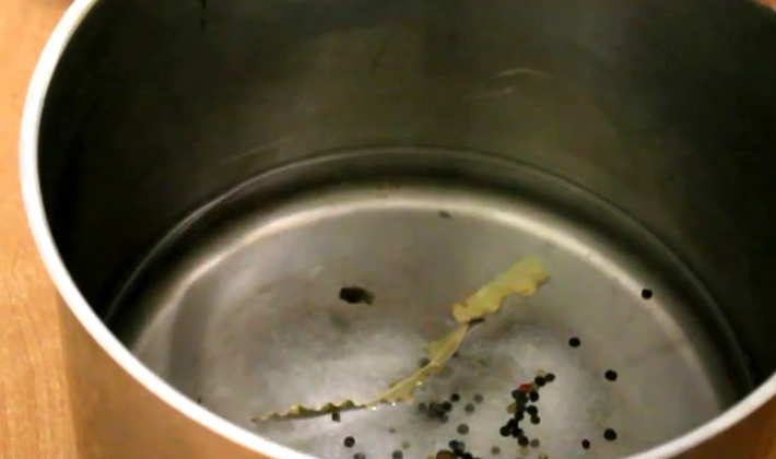 - La première étape consiste à préparer la marinade, à savoir: mélanger dans l’eau tous les ingrédients de la liste des produits (à l’exception des champignons et du vinaigre) et mettre sur le feu.