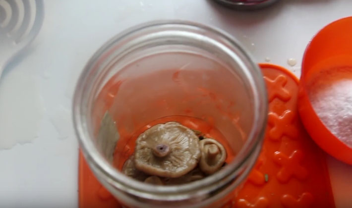 - Disposer les champignons avec les épices dans des bocaux, verser la saumure formée dans les champignons.