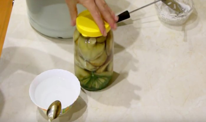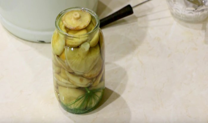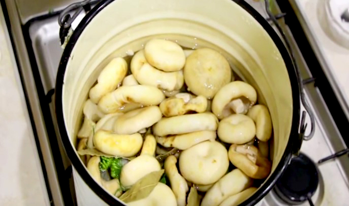 En fin de cuisson, les champignons doivent être retirés du feu et refroidir rapidement avec la marinade, en recouvrant la poêle de gaze ou d'un chiffon propre.
