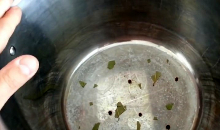 Lorsque la mousse cesse de se former dans la marinade bouillante, des épices sont ajoutées à la casserole.