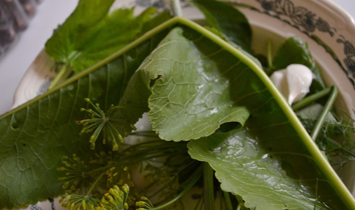 Mettez des feuilles de raifort propres et sèches dans les plats préparés.