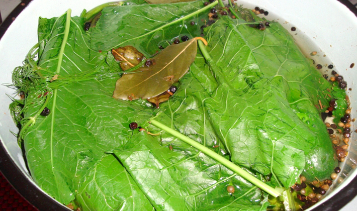 - Laissez les champignons s'écouler de l'excès de liquide, et pendant ce temps échaudez les feuilles fraîches avec de l'eau bouillante, puis laissez sécher.