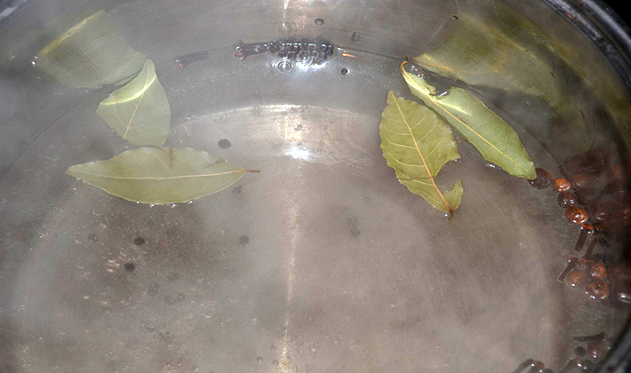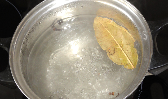 - Nous mettons la casserole sur le feu, portons à ébullition et jetons la feuille de laurier.