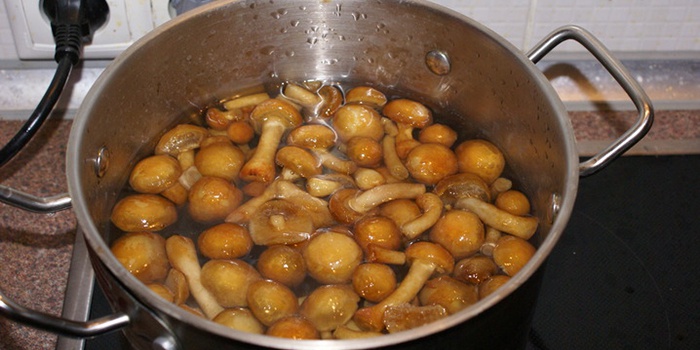 - Les champignons frais sont nettoyés de la saleté et des feuilles adhérentes, lavés à l'eau et mis dans une casserole.