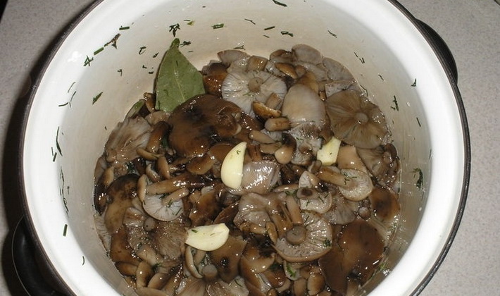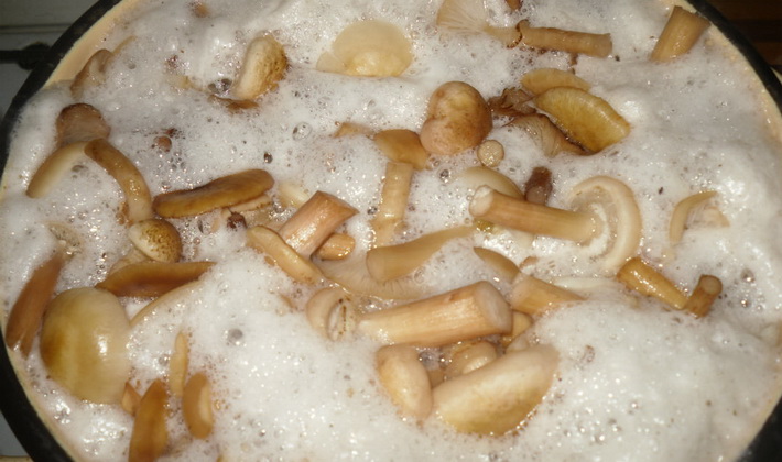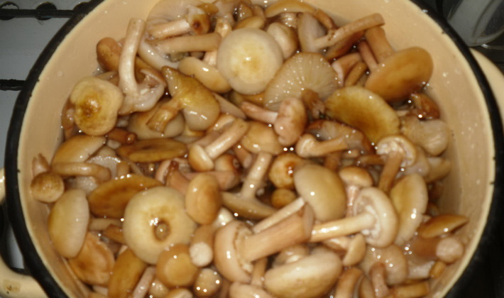 - Faites bouillir dans de l'eau salée en ajoutant 2 pincées d'acide citrique pendant 20 minutes. Lors de la cuisson, vous pouvez ajouter du laurier et du piment pour donner aux champignons une saveur épicée.