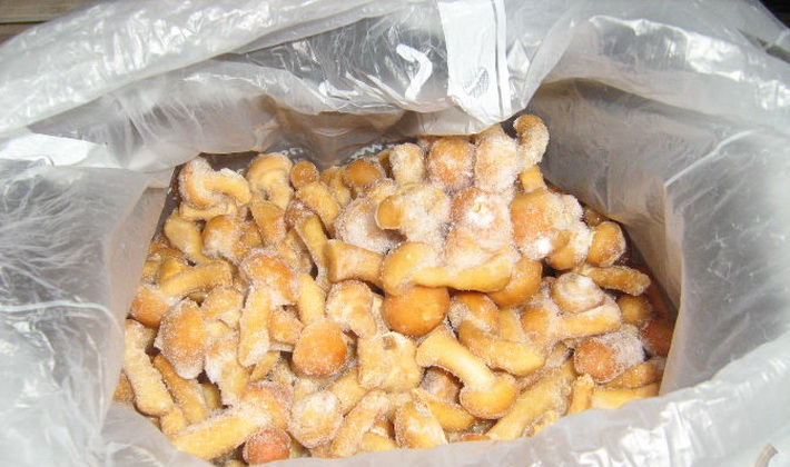 - Au bout de 2 à 2,5 heures, les agarics au miel sont retirés du congélateur, placés dans des sacs en plastique de 400 à 600 g et envoyés à nouveau au congélateur, dans le mode de congélation habituel.