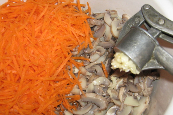 Épluchez l'ail, pressez-le sur les champignons et mélangez.