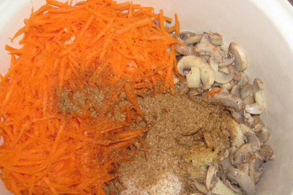 Saler les champignons, mélanger quelques épices et les reposer à nouveau.