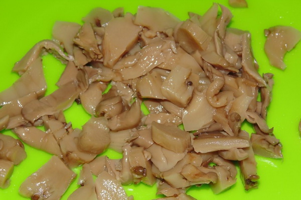 Égoutter dans une passoire, laisser refroidir les champignons et les couper en petits morceaux.