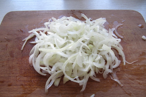 Épluchez l'oignon, coupez-le en demi-rondelles et faites bouillir avec les champignons pendant 3 minutes.
