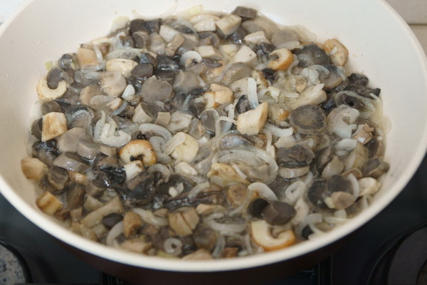 Mélanger les champignons avec les oignons et les faire frire ensemble pendant 5 minutes.