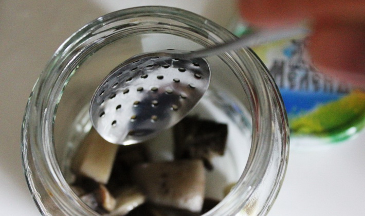 - Après cela, le produit se refroidit et se décompose dans des récipients stérilisés. N'oubliez pas que le plat résultant est versé avec le reste de la marinade.