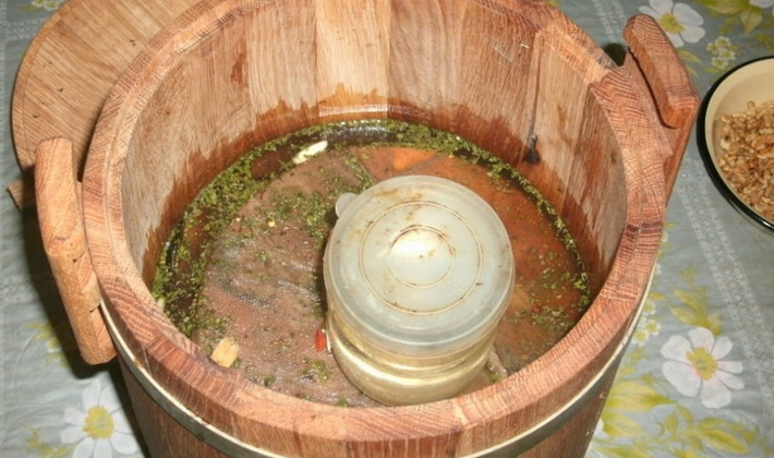 - Une fois la pose terminée, vous devez recouvrir le contenu du récipient avec un chiffon propre et y déposer un grand couvercle ou un cercle en bois. De plus, une presse est nécessairement placée sur le dessus, et ensuite seulement le cornichon est envoyé dans une chambre froide.