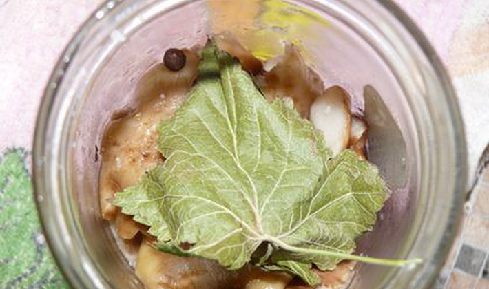 - Au bas de tout récipient en verre ou émaillé, étalez des feuilles de cerisier et de chêne propres qui donneront de l’élasticité aux champignons.