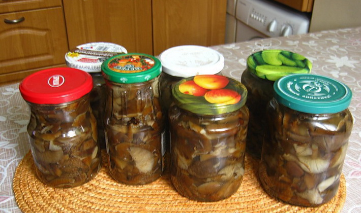 Nous offrons la possibilité de récolter des champignons d'hiver frits dans l'huile avec de l'acide citrique. La différence réside dans le fait que les champignons sont frits à feu vif, puis refroidis et refroidis sont chargés dans des bocaux.