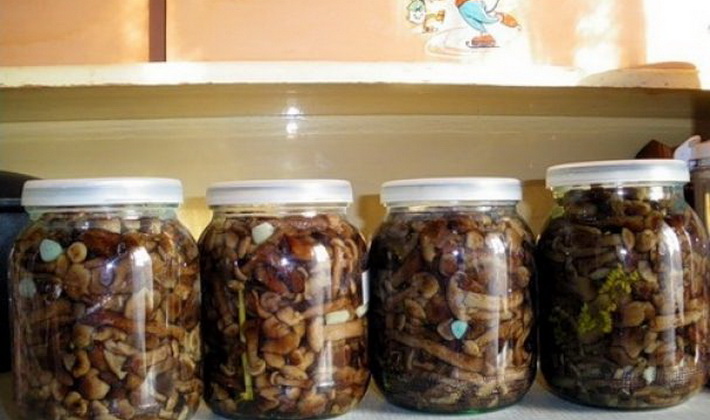 La capacité traditionnelle de stockage des champignons au miel consiste en des pots en verre que l'on peut laisser même dans un garde-manger sombre.