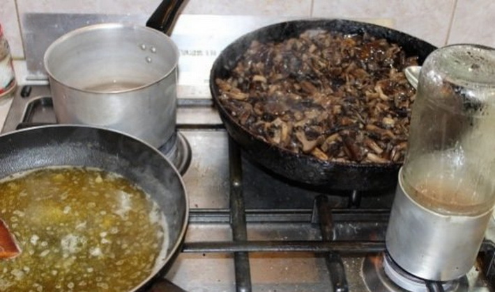 - Les champignons précuits sont répartis dans une poêle à frire chauffée à l'huile et frits pendant 20 minutes jusqu'à ce qu'ils soient dorés.
