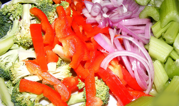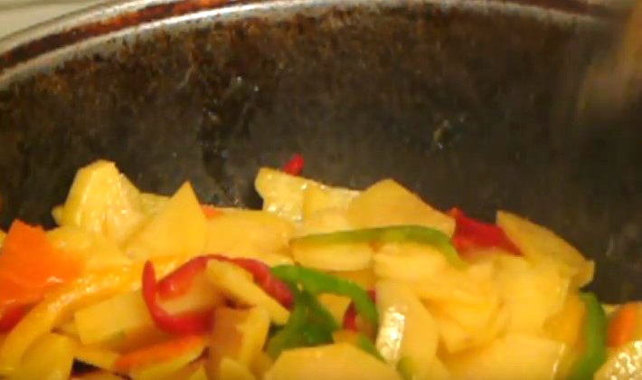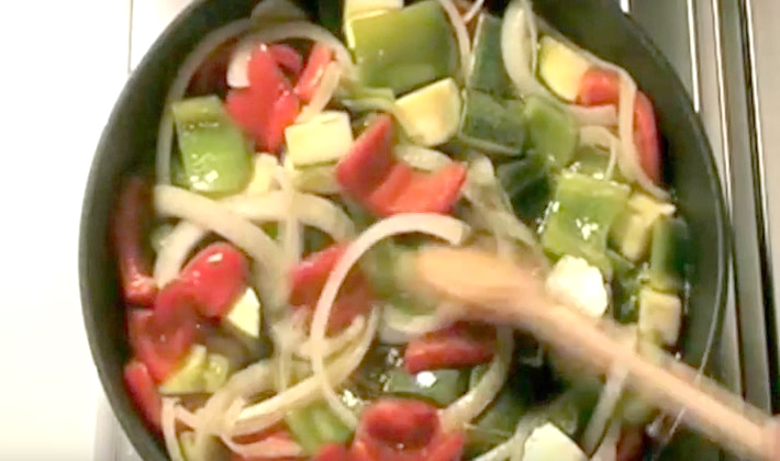 - Les poivrons sont pelés, coupés en lanières, les courgettes sont pelées et coupées en fines rondelles.