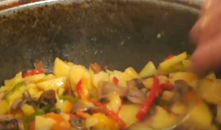 - La courgette au poivre est ajoutée aux champignons au miel, mélangée et assaisonnée de sauce soja, de poivre, de sel et de sucre.