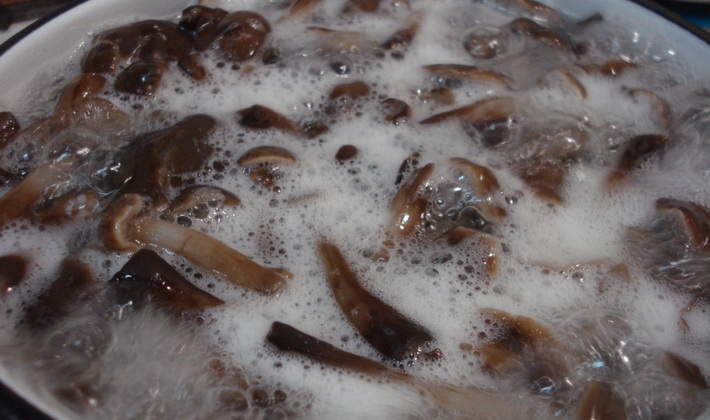 Versez de l'eau pour couvrir tous les champignons, faites bouillir pendant 20 minutes, en éliminant la mousse qui se forme constamment à la surface.